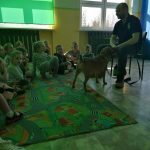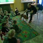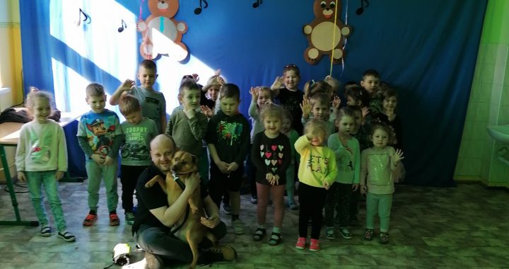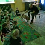 We wtorek 10 marca gościliśmy w naszym przedszkolu pana Szymona z Towarzystwa Opieki nad Zwierzętami i psa Malinę. Dzieci dowiedziały się, jak należy dbać o zwierzęta, co to jest schronisko oraz w jaki sposób można pomóc pieskom i kotkom, które tam mieszkają. Dodatkową atrakcją była wizyta psa. Wszyscy chętnie go głaskali i patrzyli, jak się łasi do właściciela. Na ręce pana Szymona przekazaliśmy dary przyniesione przez dzieci dla bezdomnych psów.