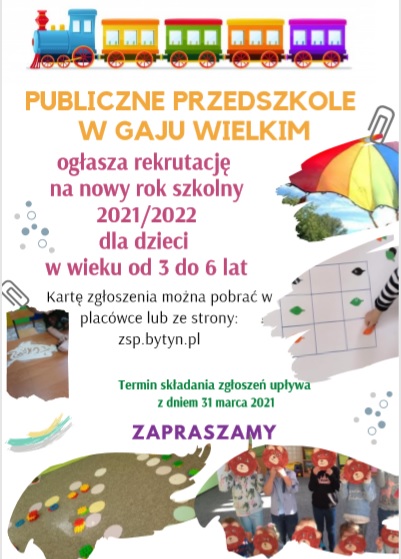Zapraszamy do zapoznania się z plakatami dotyczącymi rekrutacji do przedszkoli i klasy I na rok szkolny 2021/2022 oraz filmem promującym Publiczne Przedszkole w Gaju Wielkim.