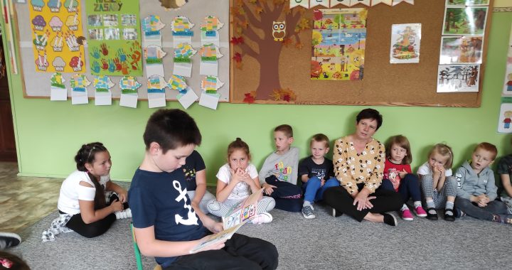 W Ogólnopolskim Dniu Głośnego Czytania pierwszoklasiści przygotowali niespodziankę 4 i 5-latkom z Publicznego Przedszkola w Gaju Wielkim. Dominika Konieczna i Franek Antoniewski czytali młodszym koleżankom i kolegom książki o Kici Koci. Przedszkolaki z zaciekawieniem słuchały o przygodach małej kotki, oglądały obrazki, a nawet wypowiadały się na temat tekstu. Uczniowie byli bardzo dumni, że mogli podzielić się swoimi umiejętnościami z większą publicznością. Na koniec dla czytelników i słuchaczy były cukierki.