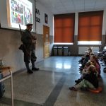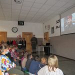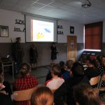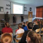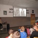 Z wielkim zaciekawieniem uczniowie obejrzeli prezentację ze szczególnymi osiągnięciami Stowarzyszenia np. udział w programie” Kuchni Lidla” – grochówkę w kuchni polowej wraz z rekonstruktorami w gotował Karol Okrasa i Dorota Wellman, udział w wielu akcjach i festynach charytatywnych, nagroda I stopnia za najlepszą dioramę przyznana podczas ogólnopolskiego zlotu grup rekonstrukcyjnych „ODYSEJA HISTORYCZNA” Kutno – Leszczynek, udział w nagraniach filmów dokumentalnych, w których brali udział rekonstruktorzy: „Powstanie Wielkopolskie. Bitwa o Chodzież”, „Obowiązek pamiętania”, „Powstanie Wielkopolskie 1918”. Fragmenty filmów zostały zaprezentowane uczniom podczas spotkania.