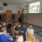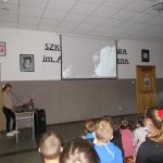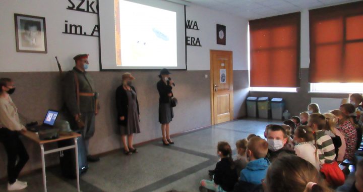 O godz. 8.30 w spotkaniu wzięli udział uczniowie klas I – III, którzy z uwagą i skupieniem wysłuchali informacji skąd wzięła się ta pasja i zainteresowanie historią, w jakich przedsięwzięciach i wydarzeniach biorą udział rekonstruktorzy. Szczególnie chłopcy byli bardzo zainteresowani prezentacją p. Jacka Dolnego na temat umundurowania i wyposażenia żołnierza walczącego w Powstaniu Wielkopolskim, które zostało zaprezentowane podczas spotkania. Dziewczynki natomiast mogły zobaczyć jak ubierały się w dawnych czasach panie.