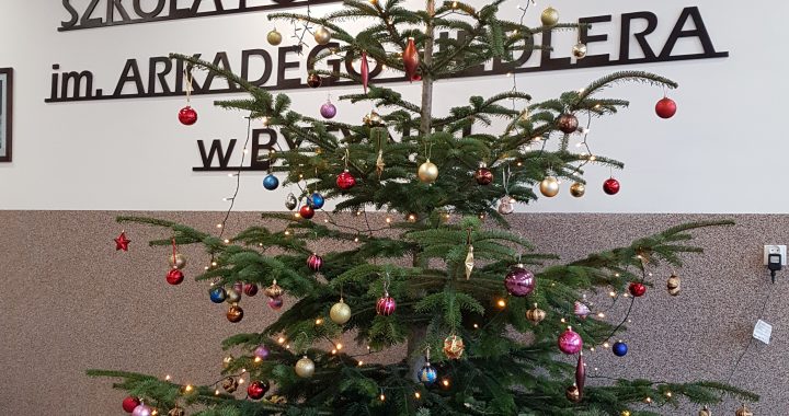 Na górnym korytarzu naszej szkoły stanęła ogromna choinka, ufundowana przez Radę Rodziców.