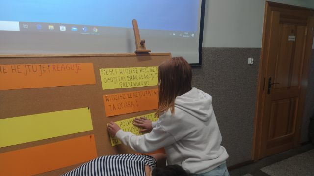 Projekt sfinalizował eksperyment pani Marzeny Bieleckiej pt. „Nie hejtujemy, reagujemy!”. Uczniowie wzięli udział w wydarzeniu w sposób spontaniczny, improwizując jego przebieg. Wydarzenie opierało się na wykonywaniu przez odważnych uczniów różnych zadań ukrytych pod wylosowanym numerem. Zadania powiązane były tematycznie z problemem mowy nienawiści wśród młodzieży. Eksperyment zakończył się wspólnym odśpiewaniem piosenki „Hejter”.