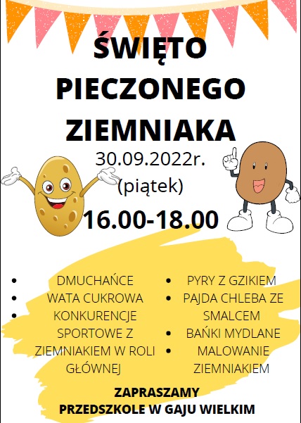 Zapraszamy na Święto Pyry Opublikowano 19 września 202219 września 2022 Kiedy? 30 września g. 16:00-18:00 Gdzie? Publiczne Przedszkole w Gaju Wielkim Opublikowano w Oddziały przedszkolne, Przedszkole, Szkoła Podstawowa.