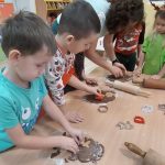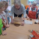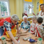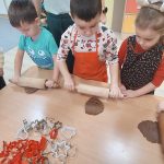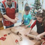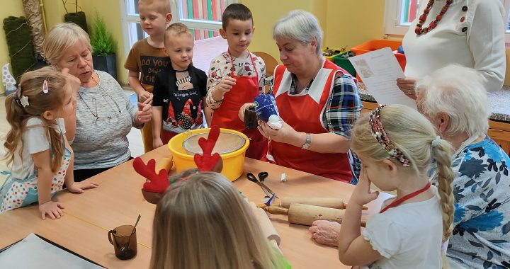 W ramach współpracy z instytucjami lokalnymi zaprosiliśmy na wspólne pieczenie pierników Panie z Klubu Seniora. Po przywitaniu gości i krótkiej rozgrzewce dzieci poznały składniki i sposób wykonania ciasta, a następnie po dokładnym umyciu rąk z pełnym zaangażowaniem zabrały się do pracy. Z przygotowanego ciasta wykrawały foremki w świątecznych kształtach. Upieczone pierniki zaczęliśmy dekorować według własnego uznania i tak powstały kolorowe świąteczne przysmaki.