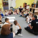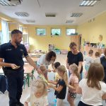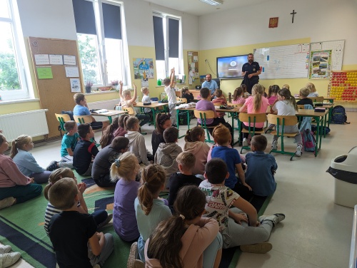 W dniu 14 września w naszych placówkach w oddziałach przedszkolnych i szkole gościł funkcjonariusz policji asp. Przemysław Juśkiewicz, który przeprowadził pogadanki profilaktyczne na temat bezpieczeństwa w drodze do i ze szkoły. Przypomniał wszystkim o bezwzględnym stosowaniu się do zasad i norm, ostrzegł, że nieprzestrzeganie prawa może doprowadzić do wypadku i poważnych konsekwencji. Podopieczni z zaciekawieniem wysłuchali policjanta, a następnie zadawali pytania, na które funkcjonariusz udzielił wyczerpujących odpowiedzi. Najmłodsi słuchacze otrzymali opaski odblaskowe. Zajęcia z przedstawicielem policji są jednym z działań realizowanych w ramach programu wychowawczo-profilaktycznego naszej szkoły.