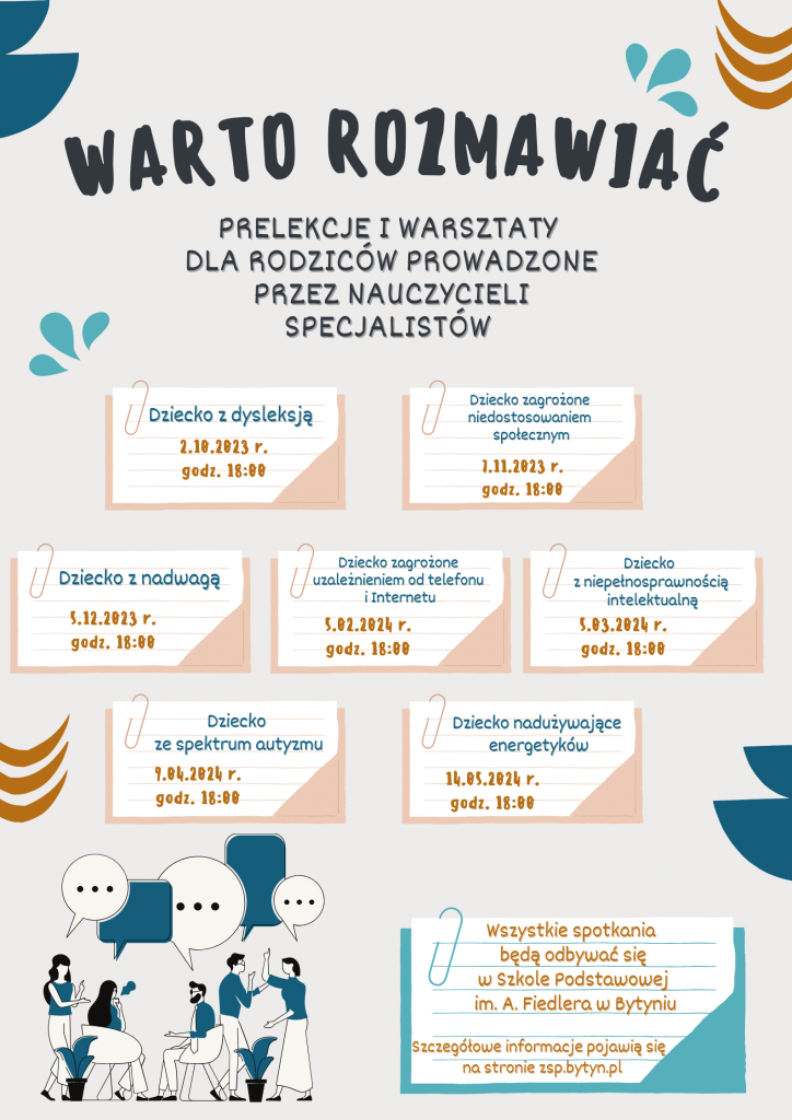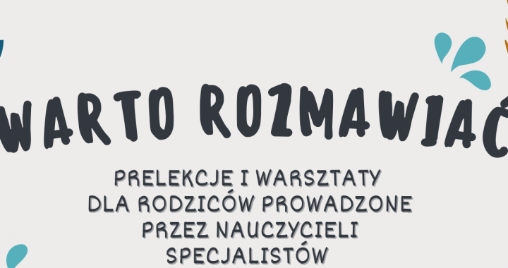 Serdecznie zapraszamy zainteresowanych Rodziców na cykl spotkań „Warto rozmawiać…” w formie prelekcji i warsztatów z nauczycielami-specjalistami. W trakcie spotkań poruszane będą tematy związane ze specjalnymi potrzebami edukacyjnymi, współczesnymi wyzwaniami i zagrożeniami, które dotykają dzieci i młodzież. Będzie to też okazja do podzielenia się spostrzeżeniami oraz wymiany doświadczeń między nauczycielami i rodzicami.