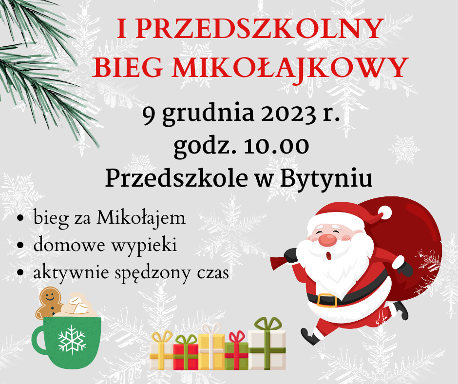 Zapraszamy na I Przedszkolny Bieg Mikołajkowy, który odbędzie się 9 grudnia o godz. 10:00 w Bytyniu (dokładna lokalizacja zostanie podana w najbliższym czasie). Zapisy u wychowawców grup do 28 listopada. Koszt udziału to 6 zł.