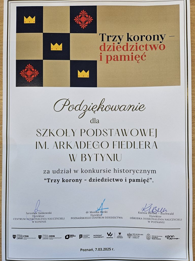 Uczniowie naszej szkoły – Jeremiasz Klak i Wojciech Krakowiak – wzięli udział w konkursie „Trzy korony – dziedzictwo i pamięć”, organizowanym przez Ośrodek Doskonalenia Nauczycieli w Poznaniu, Centrum Doskonalenia Nauczycieli w Koninie oraz Poznańskie Centrum Dziedzictwa. W ramach kategorii „gra edukacyjna Królestwo Chrobrego” uczniowie stworzyli dwie gry planszowe, które przybliżają życie i czasy Bolesława Chrobrego. Prace te nie tylko rozwijały kreatywność, ale także pogłębiały wiedzę historyczną uczestników.