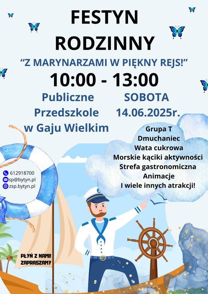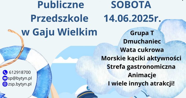 Zapraszamy na Festyn Rodzinny Opublikowano 14 maja 202514 maja 2025 14 czerwca, godz. 10:00-13:00, Publiczne Przedszkole w Gaju Wielkim Opublikowano w Bez kategorii.