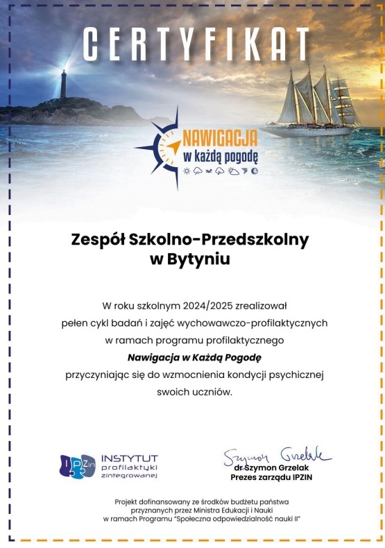 W roku szkolnym 2024/2025 nasza szkoła już po raz drugi wzięła udział w rekomendowanym programie profilaktycznym Nawigacja w Każdą Pogodę, opracowanym przez Instytut Profilaktyki Zintegrowanej. Działaniami objęto uczniów z klas V, VI, VII i VIII. W ramach programu dokonano diagnozy środowiska szkolnego za pomocą aplikacji internetowej, przeprowadzono bezpośrednie oddziaływania profilaktyczne uwzględniające wyniki badań diagnostycznych. Podczas posiedzenia RP odbyło się spotkanie informacyjne przeprowadzone przez szkolnego koordynatora NWKP. Głównym celem programu było zmotywowanie uczniów do ćwiczenia sposobów radzenia sobie w trudnych sytuacjach życiowych, w tym kryzysowych (m.in: akceptacja uczuć, kierowanie własnymi zachowaniami, szukanie wsparcia, dostrzeganie pozytywów, świadomość własnych celów życiowych, wspieranie innych). Udział w programie pomógł w zbudowaniu pozytywnego klimatu szkoły, wsparł uczniów w rozwijaniu kompetencji miękkich i wzbogacił warsztat pracy realizatorów. Co więcej wsparł szkołę w realizacji podstawowych kierunków polityki oświatowej państwa na rok szkolny 2024/2025. Szkoła otrzymała certyfikat uczestnictwa w projekcie.