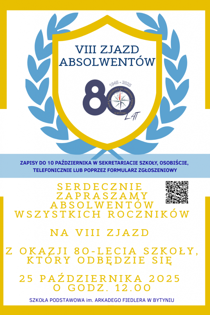 Z ogromną radością zapraszamy Was na spotkanie po latach, które odbędzie się 25 października o godz. 12:00. To doskonała okazja, by powrócić do wspomnień, spotkać dawnych kolegów oraz wspólnie świętować jubileusz 80-lecia naszej szkoły.
