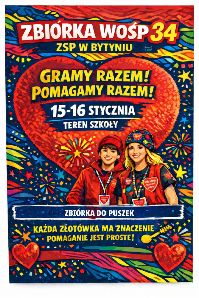 Informujemy, że w dniach 15 i 16 stycznia organizujemy zbiórkę na rzecz Wielkiej Orkiestry Świątecznej Pomocy. Przy tej wyjątkowej okazji nasi uczniowie nie tylko będą zbierać datki, ale także podzielą się wiedzą z zakresu pierwszej pomocy. Zaprezentują podstawowe zasady i praktyczne umiejętności, które mogą pomóc w ratowaniu życia.